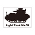 戦車ステッカー イギリスのMk.VI軽戦車の側面シルエットをステッカーにしました。 画像で白または水色に見える部分は台紙です。ロゴやイラスト部分のみを貼り付けるタイプのカッティングステッカーです。 塩化ビニール製の丈夫な素材なので、ウォールステッカーにしたりスーツケースや家電製品に貼ったりしてご活用ください。 屋外使用可能な素材を使っています。車のボディやスノーボード、バイクに貼るのもおすすめ。 Mk.VI軽戦車はイギリスの軽戦車。1928年、カーデン・ロイド豆戦車に砲塔をつけたMk.I軽戦車が開発されて以来改良が重ねられ、1936年に本格的な大量生産型として制式採用されたものがMk.VI。ダンケルクの戦いまでに1400輌が生産され、偵察用および数が不足していた巡航戦車の代替車輌として配備された。 シートサイズは幅139×高さ103mm。表面にリタックシート(転写シート)を貼った状態で送ります。 【色】 つやあり黒・つやあり白 【素材】 塩化ビニール製シート(屋外用 耐候性3年程度) 表面がなめらかな面には貼れますが、砂壁や土壁などのザラザラした面や布製品には貼れません。 【サイズ】 幅139×高さ103mm 【購入の際の注意点】 写真と実物では多少色味が異なる場合があります。 市販のカッティングマシンを使ってカットし、手作業でリタックシートを貼っているので、ステッカーとリタックシートの間に気泡が入っている場合などがあります。製品の品質には影響しませんので、あらかじめご了承ください。