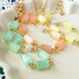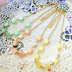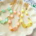 夏風そよぐ、高鳴る衝動、熱の季節。 この気持ちを、唄にしようか。 シルキーカラーが綺麗なキュービックなチェコガラス。 四角のようで・・・実は五角柱の、面白い形なのですよ・・・☆ メロン・オレンジ・レモン。 口の中でひんやりする様な飴玉みたいなビーズを華奢に繋げて。 こっそり、小さなパールキューブを挟んで。 ちょっとだけアシンメトリーな遊び心をプラス☆ 可愛らしいカラーのビーズに合わせたのは、カットの入ったキラリ光るチェーン。 甘さとシャープさを備えたデザインなのです。 MSD~SD17まで対応。 少し長めになりますが幼SDでも大丈夫です。 アジャスターにてサイズ調整可能です。 ネックレスの長さ:約15cm+アジャスター3cm 五角柱ビーズ(チェコガラス):4×5mm キューブパール(アクリル):3mm 1.2mm幅カットアズキチェーン アジャスターの先には小さな星チャームを使用。 金具:ゴールドカラー(メッキ) ※ビーズの色の出方は個々で違います。 ※ネックレス部分のサイズ調整可能です。 ご希望の方は備考欄にその旨ご記入頂くか、メールにてお問い合わせ下さい。 ※受注製作となります。