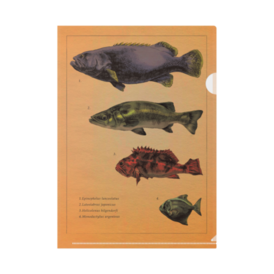 古い図鑑風のクリアファイルです。 魚は上からタマカイ・スズキ・ユメカサゴ・ヒメツバメウオです。 この商品はpixivFACTORYで作られた商品です。サンプル画像は完成イメージのため、実物と異なる場合があります。