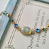 アクアマリンのサザレ石をレジン封入し、そのまわりをブルー系スワロフスキーで囲んだ豪奢なブレスレットです 夏に向けての涼し気な印象です サイズは14cm+アジャスタ5cmで最長19cmになります より短く、長くのご希望があればメッセージでお知らせ下さい 調整可能です アクアマリンさざれ石入りレジンが約2cm×1.5cmのオーバル型で、厚みが7〜8㎜あります さざれ石の他に人工オパールフレーク(ブルー系)も封入したのでキラキラ感もあります スワロフスキーはいずれもブルー系カラーです ・ラウンド型…6㎜エフェクトカラーで、覗きこむととても綺麗 ・スクエア型…3㎜アクアマリン アジャスターの先には雫型クリアカラーラインストーンをあしらいやや高級な感じになっています 何かオマケあります♪