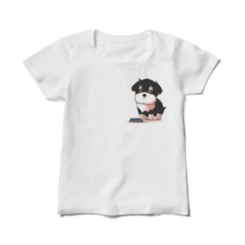 レディースTシャツ - L - 白この商品はpixivFACTORYで作られた商品です。サンプル画像は完成イメージのため、実物と異なる場合があります。 我が家のアイドル ミニチュアシュナウザーのチャキくんをモデルにしたオリジナルTシャツ。 こちらは片面印刷。 「ご飯待ち」の姿がモチーフ。