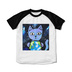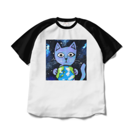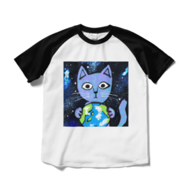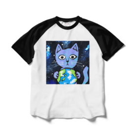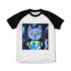 地球と猫のラグランTシャツ白黒です。 この商品はpixivFACTORYで作られた商品です。サンプル画像は完成イメージのため、実物と異なる場合があります。