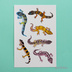 レオパードゲッコー(ヒョウモントカゲモドキ)のイラストを転写タトゥーシールにしました。 画面上、白地に見える部分は実際には透明になります。 貼り付けたときには、写真とは左右反転します。 ペットとしても人気のヤモリ レオパードゲッコー(ヒョウモントカゲモドキ)のイラスト6種を収録しました。 全6点 絵柄のサイズ 長辺48~60mm。 水で湿らせて貼り付けるだけなので簡単。はがすこともすぐできます。 タトゥーシールとして肌につける以外にも、プラスチックや金属など表面がなめらかなものに貼り付けられます。 【素材】 市販の転写シール 透明タイプ 【サイズ】 幅100×高さ148mm 【購入の際の注意点】 表面の粗いものにはきれいに転写できません。 水を使って転写させるため、紙など水に弱いものには転写できません。 肌に転写した場合は一日を目安にはがしてください。 シートは湿気を吸いやすい性質があるので、なるべく早めにお使いください。