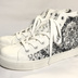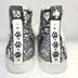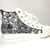 あうんちゃんの弾幕がいっぱいに描かれたハイカットスニーカーです。全て手描きなので一点ものとなっております。 サイズはレディースの24.5cm。 イラストは油性ペンで描いておりますので、色落ちしやすいです。 そのため、インク由来での黒ずみ汚れが発生しやすくなっております。 水洗い厳禁です。汚れが付着した場合は固くしぼった濡れ布巾で拭き、ゴム部の黒ずみは消しゴムでこすって落としてください。 直射日光と湿気を避けて保管していただくとより長持ちします。 あくまで素人のハンドメイド作品ですので、そのことを十分にご理解いただけると幸いです。 (靴本体は既製品) 素材 甲部:綿100% 底材:ゴム イラスト:油性インク(ペン)