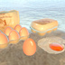 ・たまご ・たまご紙パック(未開封と開封済み) ・目玉焼き ・牛乳パック(未開封と開封済み) ・バター(未開封と開封済み、開封可能状態のモノ) ・小麦粉 ・オリーブオイル ・肉(ロース肉とモモ肉) ・肉の包み紙 ・紙袋(空とシール済み) ・紙袋買い物セット(中身入り)