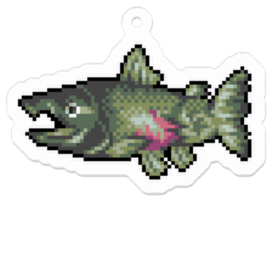 雄々しい鮭のドット絵がプリントされたキーホルダーです。 この商品はpixivFACTORYで作られた商品です。サンプル画像は完成イメージのため、実物と異なる場合があります。