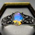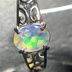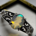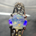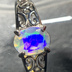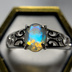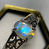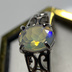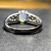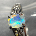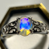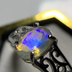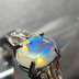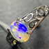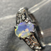 オパールのファセットカットルースを、アラベスク調の細工が施されたリングに嵌めた指輪です。 オパールは角度によって、青色、水色、青緑色など、寒色系の激しい遊色が現れます。 カメラの性質上、青色の遊色は焼き付いているように見えますが、肉眼で見ると写真よりは柔らかめに見えます。 オパールの遊色は写真で表現するのが難しく、画像にはあまり綺麗に写っていませんが、肉眼で見ると激しく美しい遊色が出るオパールです。 下記のリンクに遊色が確認しやすい動画を掲載しております。 https://youtu.be/i8pAzmxFIr4 リングはフリーサイズとなっております。 リング本体はスターリングシルバー925製(ロジウムメッキ )です。 ケースは付属しません。 透明なプラスチック袋に入れた状態でお送りします。 --------------------------------------------- サイズ: 【オパール部分】 縦…約7mm 横…約5mm 発送方法: ネコポス(匿名配送) 370円 --------------------------------------------- ***ショップ用Twitterを開設しました*** @No_002_ 作品のご意見・ご感想、リクエストなどお気軽にどうぞ。 (リクエストはパーツ仕入れ先の在庫状況などにより、お応えできない場合がございます)