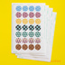 青海波、麻の葉など7種の和柄パターンをラベルシール(直径15mmの丸シール)にカラー印刷しました。 そのまま貼って装飾にする、手帳に貼る、プレゼントのラッピングに使う、手紙の封緘にするなど、用途はさまざま。 和服の柄などに用いられる青海波、麻の葉、鱗文、市松模様、三色亀甲、矢絣、七宝の7種のパターンをカラーで4片ずつ収録。 シール1片は直径15mmの円。はがきサイズのシートに28片収録。同じシート4枚のセットです。 全112ピース(28片×4シート) シールのサイズ 直径15mm 【素材】 ラベルシール マット紙・ホワイト 【サイズ】 幅100×高さ148mm(はがきサイズ)×4枚 【購入の際の注意点】 市販のインクジェットプリンタを使って印刷しているので、図柄がシールの円の中心からずれていることがあります。あらかじめご了承ください。 防水されていませんので紙濡れにご注意ください。