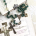 ※同じクロスがもう手に入りそうになく、一点ものになってしまう可能性が高いです。クロス違いで似たものなら再販できる可能性があります。 シャムロックの透かしが繊細にあしらわれたアンティーク・リプロダクト(復刻品)のクロスとセンターに、ケルトカラーのクォーツを合わせた「ケルト・プレシアス」。 シャムロックやケルト十字のロザリオを組むと、鈍めの質感だったり、控えめに組んでしまいがちなのですが、今回はPrecious(貴重な、大切な)の名に相応しい「輝度(貴度)高めのケルトアイリッシュ系ロザリオ」。 高品質のグリーンクォーツ128面カットをベースに、主の祈り部分はレモンクォーツ。抑えたカラーの石を選びましたが、透明度の高い総天然石製です。クロスもセンターも両面同柄、ボディのないデザインのクロスなので、持ちやすいかと思います。付属のシャムロックモチーフ(こちらはアクセサリーパーツで聖品ではありません)は取り外し可能です。 (自己満足でお高価い素材ばかり使ってしまったので、お値段は「つくりたかった割引」になっております。同じ素材のものを作ったら次はこのお値段では出せないかと思います。お目に留めてくださった方がいらっしゃいましたらどうぞよろしくお願いします) お祈りのためのロザリオと同仕様で、カンの類は一切ついていませんが、そのまま首に掛けることができるサイズです。 クロス:約4.2×2.7(トップのカンは含まず) 環の内周:約64~66(若干の個体差が出ます) 珠:6ミリ 地金基本色:ブロンズ 中が二室に分かれたアクセサリーポーチが付属します。