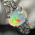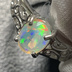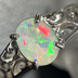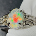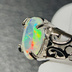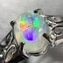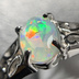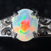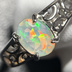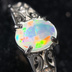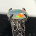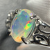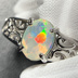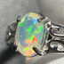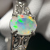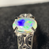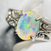 オパールのファセットカットルースを、アラベスク調の細工が施されたリングに嵌めた指輪です。 オパールは角度によって、青色や赤色、緑色、水色、黄色などの遊色がバランス良く現れます。 『オパールのアラベスク調リングD』と比べると、ややぱっきりとした遊色が、全体的にちらちらと目まぐるしく現れる印象です。 カメラの性質上、青色の遊色は焼き付いているように見えますが、肉眼で見ると写真よりは柔らかめに見えます。 オパールの遊色は写真で表現するのが難しく、画像にはあまり綺麗に写っていませんが、肉眼で見ると美しい遊色が出るオパールです。 下記のリンクに遊色が確認しやすい動画を掲載しております。 https://youtu.be/CrgzO2SoHNM ※オパールのテーブル(正面になる面)部分に仕入れ時からの小傷があります(写真9枚目参照)。 そのため、本来の価格より若干お安くしております。 リングは標準約13号のフリーサイズとなっております。 リング本体はスターリングシルバー925製(ロジウムメッキ)です。 ケースは付属しません。 透明なプラスチック袋に入れた状態でお送りします。 --------------------------------------------- サイズ: 【オパール部分】 縦…約7mm 横…約5mm 【内径】 約17mm(約13号) 発送方法: ネコポス(匿名配送) 370円 --------------------------------------------- ***ショップ用Twitterを開設しました*** @No_002_ 作品のご意見・ご感想、リクエストなどお気軽にどうぞ。 (リクエストはパーツ仕入れ先の在庫状況などにより、お応えできない場合がございます)