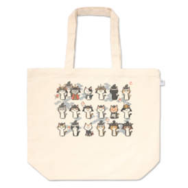 トートバッグ - L - プリント面積中ゆるい瀬戸内海な猫たちのトートバッグです。 (描かれている猫たちのお名前は2枚目の画像をご覧ください。) 【本体のサイズについて】 ・Sサイズ/4L/300×200mm ・Mサイズ/10L/360×370mm ・Lサイズ/19L/480×400mm この商品はpixivFACTORYで作られた商品です。サンプル画像は完成イメージのため、実物と異なる場合があります。