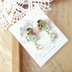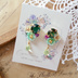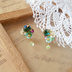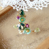 1.2㎝の透かしパーツの上に、8㎜スワロフスキーをメインに、5~7㎜のフラワーパーツ、小粒スワロフスキー、アクリルパーツ、を貼り付けてチャームを作りピアス本体に貼り、ドロップビーズを繋げました。