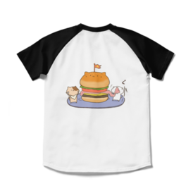 ラグランTシャツ - XL - ホワイト×ブラックねこのハンバーガーに食いつくにゃんことにゃんたです🐱 この商品はpixivFACTORYで作られた商品です。サンプル画像は完成イメージのため、実物と異なる場合があります。