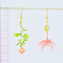 こちらは金魚と水草のピアス(イヤリング)になります。 夏らしい、透け感のある金魚になりますので、これからの季節にお使いいただけるかと思います。 また浴衣やお着物の柄に合わせて使っていただけるかと思います。 【イヤリング、樹脂製ピアスへの変更可能です。】 お気軽にご相談ください。 全長約6センチ 素材 花飾り部分:真鍮、樹皮液、レジン ピアス部分:スチール 花飾りはレジン液で硬化させて強度を上げていますが、繊細な作品になりますので、取り扱いにはご注意ください。 水に濡らしたり、直射日光、高温多湿な場所での保管は破損や劣化の原因に繋がりますので、控えてください。 強い衝撃を加えると破損に繋がりますので、お気を付けください。 ご不明な点がございましたら、お気軽にご質問ください。