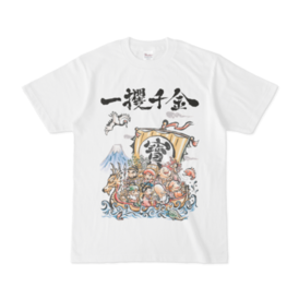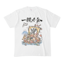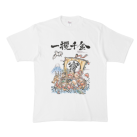 Tシャツ - XL - 白この商品はpixivFACTORYで作られた商品です。サンプル画像は完成イメージのため、実物と異なる場合があります。 七福神シリーズ 一攫千金 いっかく-せんきん 苦労することなく、一度の機会で大金を手に入れること。 「一攫」は一度つかむこと。 「千金」は大金のこと。
