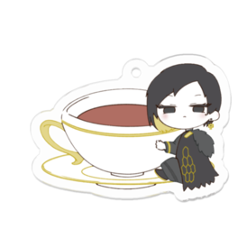 ティーカップを抱えるちいさなビナー様のアクリルキーホルダーです。実際の色味は写真をご覧下さい。