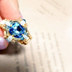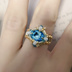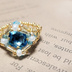 カットの入ったスクエア型のアクアマリンカラーのスワロフスキーを中心に編んだリングとなっております