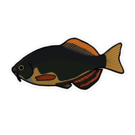 ステッカー - 100 x 100 (mm)(1)日本の淡水魚「アブラボテ」のデフォルメイラストのステッカーです。暗い中に仄かな緑が入り、ひれの橙色が差し色になっている渋い魅力のあるお魚です! サイズは100×100(mm)です。 通常の白い背景のものと透明な背景のものをご用意しております。 背景が透明になっているものは、どんな場所でも色を気にせずにお使い頂けます。