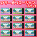 Brown(茶) Blue(青) BluePink(青×ピンク) Gray(灰) Green(緑) Orange(橙) OrangeYellow(橙×黄) Pink(ピンク) PinkRed(ピンク×赤) Red(赤) Yellow(黄) YellowGreen(黄×緑)