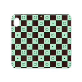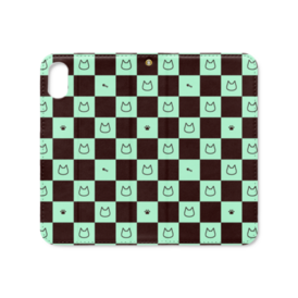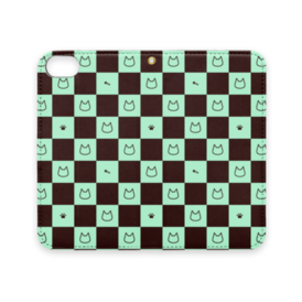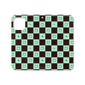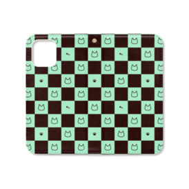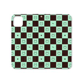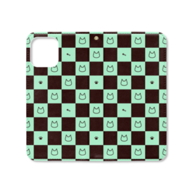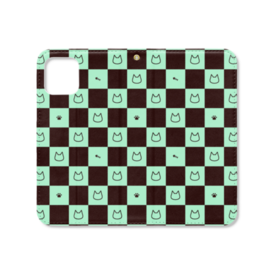 市松猫柄の和風な手帳型iPhoneケース ベルトなし - チョコミント