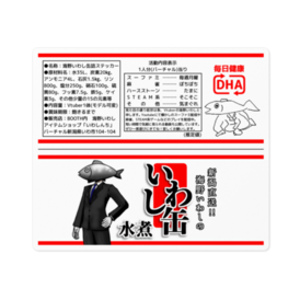 ステッカー - 100 x 100 (mm)いわしの缶詰をイメージしてデザインされたステッカーです。 缶詰の側面を想定したデザインでシール部分の縦幅は約8cm。 中央の黒線をハサミで切る事で約4cm幅のシールに分割可能、実際に缶詰に貼ってお楽しみいただけるサイズとなっております。 この商品はpixivFACTORYで作られた商品です。サンプル画像は完成イメージのため、実物と異なる場合があります。
