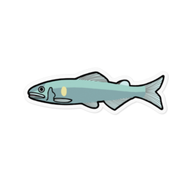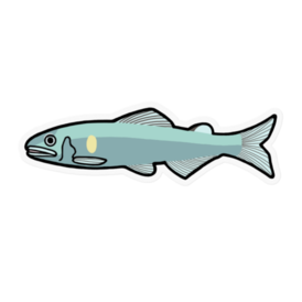 ステッカー - 100 x 100 (mm)日本の淡水魚の代表格「アユ」のデフォルメイラストのステッカーです。しなやかな体型と綺麗な体色、特徴的な可愛い顔をしたお魚です! サイズは100×100(mm)です。 通常の白い背景のものと透明な背景のものをご用意しております。 背景が透明になっているものは、どんな場所でも色を気にせずにお使い頂けます。
