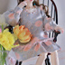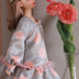 ・白で、地柄による繊細な光沢。染めで背景の青に青菊、灰菊、橙菊が咲き誇ります。全体的に水玉になっていて可愛いです。柔らかい手触り。 ・胸元のビーズ、リボン、腰回りのフリルテープはピンク ・在庫の2点はリボンの位置が左右対称になっています、ランダムでお届け予定