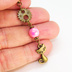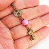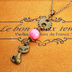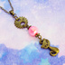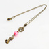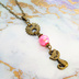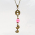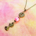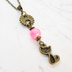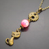 アンティークカラーの猫と歯車のシンプルで可愛いネックレス ピンクカラービーズ スチームパンク風