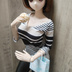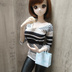 モデル:Smartdoll(LS胸)、DDdy セット内容 ・七分袖カットソー(単品) (ドール本体、パンツ、アクセサリー、靴及び撮影用小物は付属しません) Smartdollサイズのレディース用アウトフィットです。 日常使いしやすいシンプルなデザインのボーダー柄です。襟ぐりは前後ともVネックになっており、適度に肌見せしてくれます。 生地の使う場所により、柄の出方はランダムになる場合がございます。画像と異なる場合もありますので、予めご了承ください。 色移りの心配は低いかと思いますが、着せっぱなしにする際は念の為時々ご確認いただくことをお薦めいたします。 Smardollのレディースサイズが基準です。(女子はLS胸まで確認済み。) その他DDベースボディⅢM胸及びDDdyデフォルトボディは着用確認済みです。 撮影小物 シューズ:Doll Shoes Factory ミニチュアフェイクフード:あおさぎドールラボ