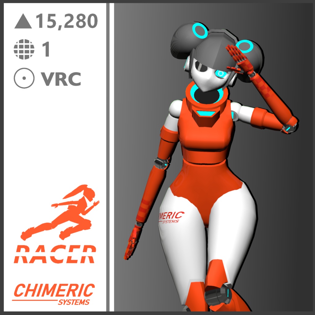 "Take on first place with CHIMERIC SYSTEMS racing bots!" Includes: Original FBX model file Original materials + textures Rigged prefab for VRChat avatar 3.0 Requirements: VRChat SDK3 (For use in VRChat) Poiyomi Toon Shader (free): https://github.com/poiyomi/PoiyomiToonShader Specs: Tris: 15,280 Materials: 1 VRChat performance: Good Contact/Questions/Comments: https://twitter.com/WeemoVR © 2021 Chimeric Systems All Rights Reserved