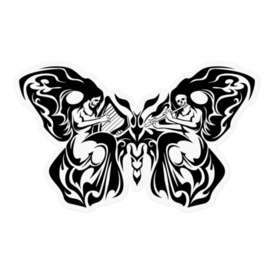 闇夜で怪しく輝く美しさもある。 トライバルデザインの蝶、楽器を演奏しているドレス姿の女性が向き合っている様を表現。