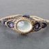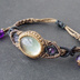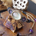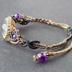 透明度の高いグリーンフローライトと 鮮やかなアメジストを ワックスコードで編み上げました。 淡いグリーンと 華やかなパープルの対比が とても綺麗です。 デザインも、 立体的な編み方になっているため 二色の紐色とあいまって、 存在感があります。 個性的ではありますが、 編み込みの細かな部分と そうでない部分にメリハリがあり 装いを邪魔しません。 年間を通して 使用しやすい作品です。