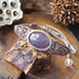 神秘的な輝きの アイオライトサンストーン、 別名ブラッドショットを ワックスコードで編み上げました。 アイオライトサンストーンは 名前の通り、アイオライトと サンストーンが混ざった、不思議な石です。 濃い藍色と、 鮮やかなオレンジ色が混ざり合い、 夜と昼の間のような 不思議な色合いが魅力的。 写真では分かりにくいですが、 アイオライトサンストーン特有の 雲母に似たシラー(輝き)が強く クオリティの高い石を選びました。 実物は、かなり素敵ですよ! こちらの作品の アイオライトサンストーンは、 シルバーめの輝きで、 多色のきらめきも見られます ほんのり透明度も高く、 銀河か星雲のようなイメージです。 石自体もとても美しく、 デザインも細やかで使いまわししやすく おすすめの作品です(*^^*)