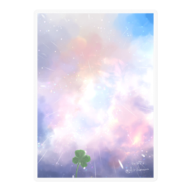 ステッカー - 100 x 100 (mm)以前描いたこのイラストを見て 「しあわせな気持ちになりました!」と お声をいただいたイラストが ステッカーになりました! 四葉のクローバーと光さす 空からの雨をみていたら 幸運がそっとあなたの背中を おしてくれるかもしれない…? そんなステッカーです。