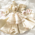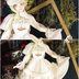 ・トップスの襟は取り外し可能です。 肩のフリルやチェーン類で華やかにし、肩章は編み込んで製作しました。 また、袖は肩が見えるデザインにし、裾にはフリルやビーズ、リボンを付けました。 ・スカートは生地をたっぷり使いましたので、座った状態でも広がり、円形になります。また、裾の花は一つ一つ手作りしました。 ・裾にループをつけましたので、(左右2ヶ所)指を通してスカートを持ち上げる事が出来ます。 ・エプロンは裾に金のブレードを付け、大きめのバックリボンを付けました。 ・帽子は軍帽をイメージして製作しました。金の紐を編み込み、トップスと共通のパーツや透かしパーツを付けました。 ・靴はレース生地とピンクの生地を合わせて表面を淡い色合いにし、バックリボンとパールビーズを付けました。また、中敷きもピンクのストライプで、脱いだ際も可愛らしくなるよう製作しました。 ・イヤリングはトップスの装飾が生きるよう、シンプルに仕上げました。