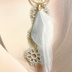 中央のメタルパーツで月相の顔の装飾を、ホワイトとグレーのフェザーで使い鳥をそれぞれイメージして使用しました。