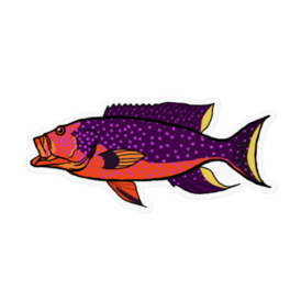 ステッカー - 100 x 100 (mm)日本近海で見られるハタの仲間たちを描いたハタスケッチから「バラハタ」のクリアステッカーです。オレンジと紫の体に赤紫の斑点模様と黄色のヒレの模様が鮮やかなお魚です! バラハタ推しの方はぜひ!