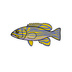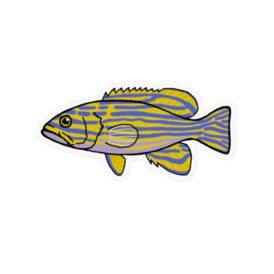 ステッカー - 100 x 100 (mm)日本近海で見られるハタの仲間たちを描いたハタスケッチから「ミナミハタ」のクリアステッカーです。黄色と青色の縞模様の体がかわいいお魚です! ミナミハタ推しの方はぜひ!