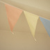 ・ハンドメイドのフラッグガーランドです。 ・色はピンク、クリームイエロー、水色の3色です。(パソコンの画面によって写真と実際の色との相違が多少あります。) ・2本以上つなげても色のグラデーションが自然になるように配色しています! ・全長約2.9mのコットンリボン(ストライプ柄)に、横約15㎝、縦約25cmの三角形の布(チノクロス)を15枚縫い付けています。 三角形は縦横の長さを黄金比としましたので、誰から見てもバランスがよく、すっきり美しく見えます。 ・リボンの両端は輪状に加工していますので、飾りつけ時に棒や画鋲などに引っ掛けることができます。 ・キャンプでのサイトデコレーションや、パーティーなどの飾りに最適です!。