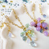 秋の実り、たわわ。 チェコガラス雫ビーズを贅沢に沢山使用。 サイズ・色違いで房を表現しました。 マスカットカラーはアクア~ライトグリーンのツートンカラー、 オパールパープルもシルキーでギブレ感もあるマーブルカラーです。 真鍮製の葉っぱパーツもポイント使い。 秋の始まり、タートルネックセーターにぴたっりなセミロングサイズ。 ふわっとブラウスやワンピースにも。 襟のの下を通して、セーラーワンピ等に合わせても可愛い。 可愛い系の男の子ドールに合わせるのもいいですね…グヘヘ。 MDD~DDサイズ 15cm+アジャスター 2mm幅デザインフィガロチェーン ドロップ(チェコガラス):5×7mm/4×6mm 葉っぱチャーム:約8mm アジャスターの先にも同色のチェコドロップビーズ4×6mmを使用。 金具:ゴールドカラー(メッキ) ※葉っぱチャーム:真鍮無メッキ ※ビーズの色の入り方は個体差があります。 ※ネックレス部分のサイズ調整可能です(無償範囲内)。 ドロップチェコガラスビーズのカラーオーダー製作可能です。 ご希望の場合はメッセージにてご連絡頂くか、事前にお問い合わせ下さい。 ※受注製作となります。 ※ドールは商品に含まれません。