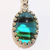リグルにぴったりの美しいストーンを見つけたので製作しました。 ストーンはチェコ製のヴィンテージ物(30年以上99年未満経過)のガラスストーンです。澄みきったブルージルコンカラーの周りを、うっすらと透ける黒いラインが取り囲んでいるデザインです。サイズは14×10㎜。 留め金具は真鍮製で表面が銀古美に加工されており、爪部分にデザインが施されています。底の部分が抜けているのでストーンの透明感とラインの立体感を引き立てています。JBB社製。 セメダイン社の透明な化学反応接着剤とセッティング爪で固定しています。 チェーンは丹銅素材でその他の部分は真鍮。銀色にメッキされています。長さは約55㎝。アジャスターで約60㎝まで調節できます。