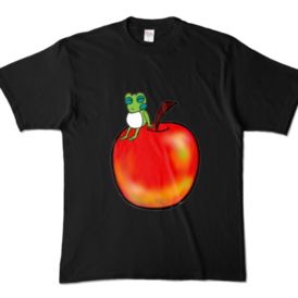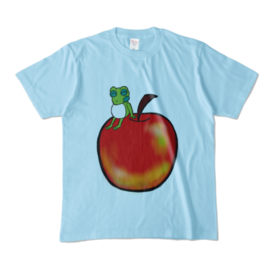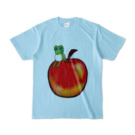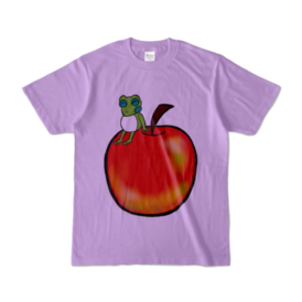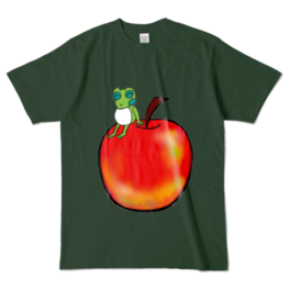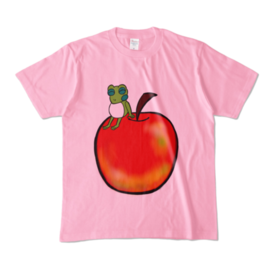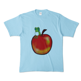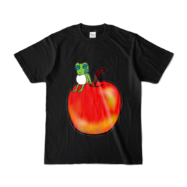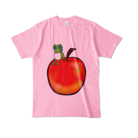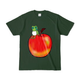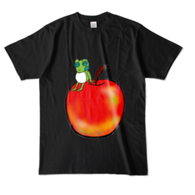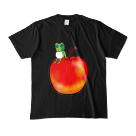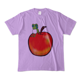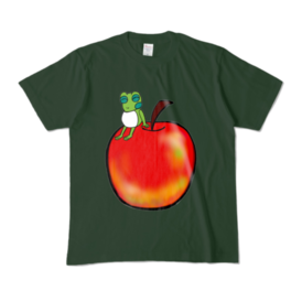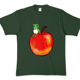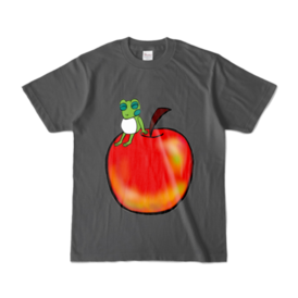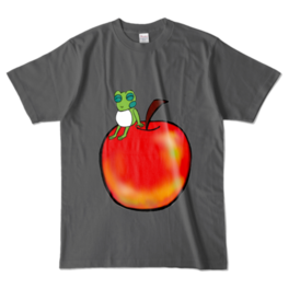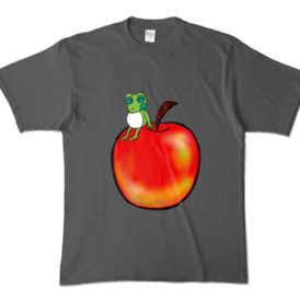 りんごの上に乗っているカエル君です。 カラーはチャコール、ライトブルー、ピーチ、ブラック、フォレスト、ライトパープルの6色。