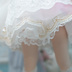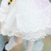 ブラウス、スカート、アンダースカート、背中リボン、襟、エプロン、髪飾り 【ブラウス】 花の刺しゅうが施したソルトチュール生地で制作したブラウスです(花柄の位置はランダムになります)ほどよくの透け感があります。 【スカート】 パステル系のグラデーションのチュール生地で制作しました。 【アンダースカート】 固いチュール生地とジョーゼットで制作した円形アンダースカートです。裾には金色入りレースを縫い付けました。 【背中リボン】 水色とピンクのチュール生地で組み合わせたリボンです。妖精のような軽やかな風合いにしました。 【髪飾り】 チュールリボン、レース、造形で組み合わせたものです。コム仕様となります。 【襟】 白のTCブロード生地の上にレース生地重ねて制作しました。金色の細いブレードでアクセントにします。 【エプロン】 柄入りのチュール生地とレースで合わせて制作しました。