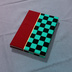 = 作品仕様 = 【形式】 表:横二枚継ぎ 裏:同様 【裂地】 左側:市松模様(黒・緑)/右側:臙脂色無地 【筋】 金茶染斜子(細目) 【帳面】 奉書紙(B5)二つ折り×表12枚24面 裏11枚22面 【サイズ】 大判(B6) [約]縦18.5cm 横13cm 厚み1.5cm 【重さ】 [約]190g 【制作期】 2021年8月 【特徴】 表紙は厚紙を芯として使い、布地との間に、折り畳んだ紙を中綿のように挟んで張っているため、ふっくらとした厚みと風合いがあります。題簽(表題を書く紙)は白紙ですので、御朱印帳、集印帳、スタンプ帳など、目的に合わせてお使いください。 【解説】某人気漫画で流行中の柄を取り入れた作品。御朱印帳を求める世代に合わないのか、商標権的な問題を忌避されるのか、あまり売れていません。柄だけであれば商標権に抵触しないので、商品として問題はないはずですが……