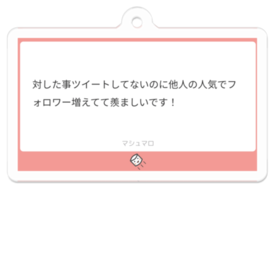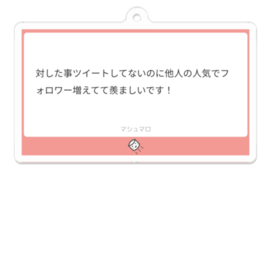 アクリルキーホルダー - 70 x 70 (mm)この商品はpixivFACTORYで作られた商品です。サンプル画像は完成イメージのため、実物と異なる場合があります。 激アツまろのキーホルダーです! 文面 【対した事ツイートしてないのに他人の人気でフォロワー増えてて羨ましいです!】