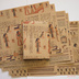 古代エジプトの「死者の書」に描かれた絵柄の紙製ブックカバーです。 ブックカバーのサイズはA4判。天地左右を折って文庫、新書のカバーとして使うことができます。 絵柄の違う3種各2枚で1セット。 「死者の書」とは、古代エジプトで冥福を祈り死者とともに埋葬された葬祭文書のこと。中でも著名な2つの死者の書から絵柄をトレースしました。 1枚め 「アニの死者の書」。アヌビス神が、真理の女神マァトの羽と審判を受ける死者の心臓の重さを天秤で測っている場面 2枚め 「フネフェルのパピルス」(フネフェルの死者の書)。墓の前で「開口の儀」を受けている死者のミイラをアヌビスが後ろから抱いて立たせている場面 3枚め 「フネフェルのパピルス」(フネフェルの死者の書)。心臓の計量に合格した死者(フネフェル)をホルスが玉座に座っているオシリスに紹介する場面 使用した用紙は再生紙(コピー紙よりやや厚く、黄味がかった白)とクラフト紙(ブラウン)の2タイプ。お好みのほうをお選びください。ブックカバーとして使うだけでなく、小物の包装紙、写真撮影の背景紙などアイデア次第でいろいろ活用できます。折らずに発送します。 【素材】 再生紙 厚さ0.10mm クラフト紙 厚さ0.11mm 【サイズ】 A4判(幅297×高さ210mm)×6枚 【購入の際の注意点】 市販の用紙にインクジェットプリンタでカラー印刷したものです。 写真と実物では多少色味が異なる場合があります。
