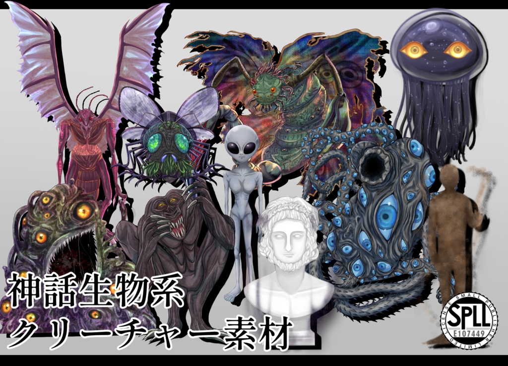 !閲覧の際はご注意ください。! こちら個人的に使用したクトゥルフ神話TRPG、神話生物の立ち絵となっております。 お好みのサイズに変更、トリミングしてご利用ください。 一部トリミング済み(縦350px)の物があります。 PNG形式(透過) [種類] ・ガスト ・グラーキ ・グレイ(全身、トリミング有) ・ゴグ=フール ・シャッガイからの昆虫 ・ショゴス ・塵人間(全身、トリミング有) ・バオートズァックァ=モグ ・ヒプノス ・夢のクリスタルライザーの守護者 まとめパック 神格パック(ゴグ=フール,バオートズァックァ=モグ,ヒプノス) 計3種類 その他パック(ガスト,グラーキ,グレイ(2枚),シャッガイからの昆虫,ショゴス,塵人間(2枚),夢のクリスタルライザーの守護者) 計7種類 ===================================================== ■著作権表示■ 本作は、「 株式会社アークライト 」及び「株式会社KADOKAWA」が権利を有する『クトゥルフ神話TRPG』の二次創作物です。 Call of Cthulhu is copyright ©1981, 2015, 2019 by Chaosium Inc. ;all rights reserved. Arranged by Arclight Inc. Call of Cthulhu is a registered trademark of Chaosium Inc. PUBLISHED BY KADOKAWA CORPORATION 「クトゥルフ神話TRPG」 PUBLISHED BY KADOKAWA CORPORATION 「新クトゥルフ神話TRPG ルールブック」 =====================================================