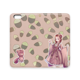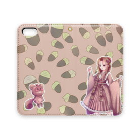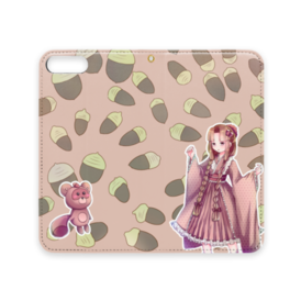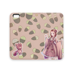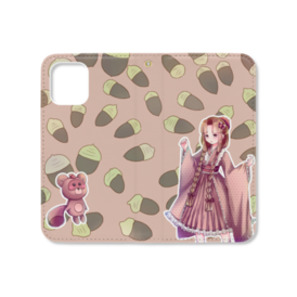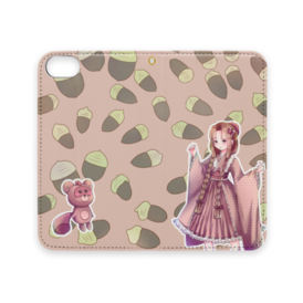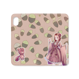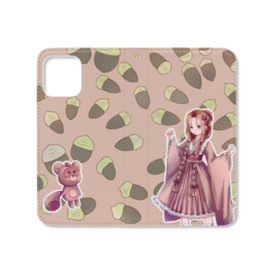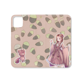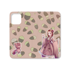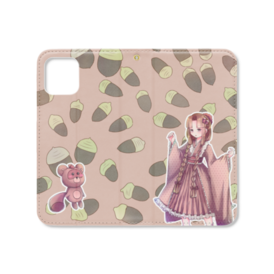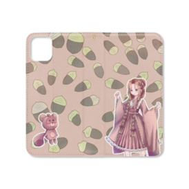 手帳型iPhoneケース(ベルトなし) - iPhone12 mini - ストラップ穴 あり茶色のどんぐりを背景に、ゆるいタヌキさんと可愛い少女のキャラクターがデザインされた、手帳型iPhoneスマホカバーです。 この商品はpixivFACTORYで作られた商品です。サンプル画像は完成イメージのため、実物と異なる場合があります。