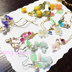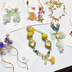 春組モチーフフラワーをプラ板で作ったアクセサリーです。 花はすべて、表面がマットな状態です。レジンやアーティスティックワイヤーなどを使っています。 ハンドメイド品ですので、その点ご了承の上お求めください。 すべて1点ものです。まったく同じものはできないと思います。 ●咲也--チェーン40センチ+アジャスター5センチ ペンダントトップに桜、スワロフスキー、パール、チェコガラスのしずくが揺れる。いちばんおとなしい感じ、鎖骨の間くらいにペンダントトップがきます。花の部分はワイヤーなので、少し動かすことができます。 ●シトロン--アジャスター込みでチェーンは60センチほど。2種類のチェーンを組み合わせていてゴージャスなんですが絡みやすいので注意してください…(他のとセットで置かないでね) コットンパール、ロンデル(オーロラカラー)、ガラスビーズ、チェコガラス、ジャスミンの花5輪。(5月生まれだから) ●真澄--イヤリング。スミレの花と、コットンパールと、スワロフスキー(裏側)、雫型のチェコガラス、ぐるぐるしてるメタルパーツ。イヤリング金具もぐるぐるしてる(シリコンカバーつき)。とても一途。長さ9センチくらいある。 ●綴---ブレスレット。15センチ+アジャスター5センチ。タンポポの花と、大き目のビーズとスワロフスキー、チェコガラス等組み合わせたおおぶりのブレス。パーツが存在感あるのでニットのそでの上とか付けるとあいそう。 ●至---ブレスレット。カニカンでなく、ぎゅってしめるタイプのブレスレットなので着脱がしやすいんだけど、アジャスターが長いので装飾に全振りしたよね…アクセサリーってそんなだよね…っていう至さんが見える。アジャスター込みで30センチくらいある。 ストロベリークォーツ、スワロフスキー、ガラスビーズ、メタルビーズ、リボンの装飾。ガーベラにもスワロつき。 ●千景--ピアス(イヤリング金具へ変更もできます。希望の方は購入後メッセージよりお申し出ください) スズラン各4輪(4月生まれだから)コットンパール、チェコガラスなど。これのみシルバーベース。清楚な感じ。飾り部分は4センチほど。