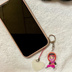 10cmのともちピンクカラフル忍者ともちピンクのアクリルキーホルダーです。 スマホと一緒に撮ってあるのは5cmのキーホルダーです。